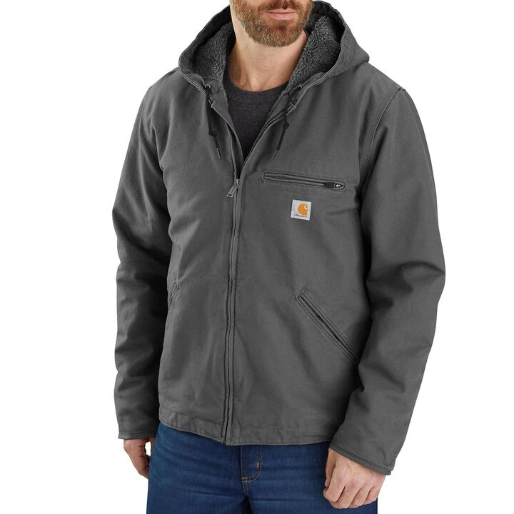 Carhartt® Men’s Relaxed Fit Washed Duck Sherpa-Lined Hooded Jacket is built to brave wind, cold, and hard days on the job. It’s made of heavyweight cotton duck sanded and brushed for softness. It’s made for comfort, with internal rib-knit cuffs and a warm Sherpa lining. Engineered for high warmth in severely cold conditions.