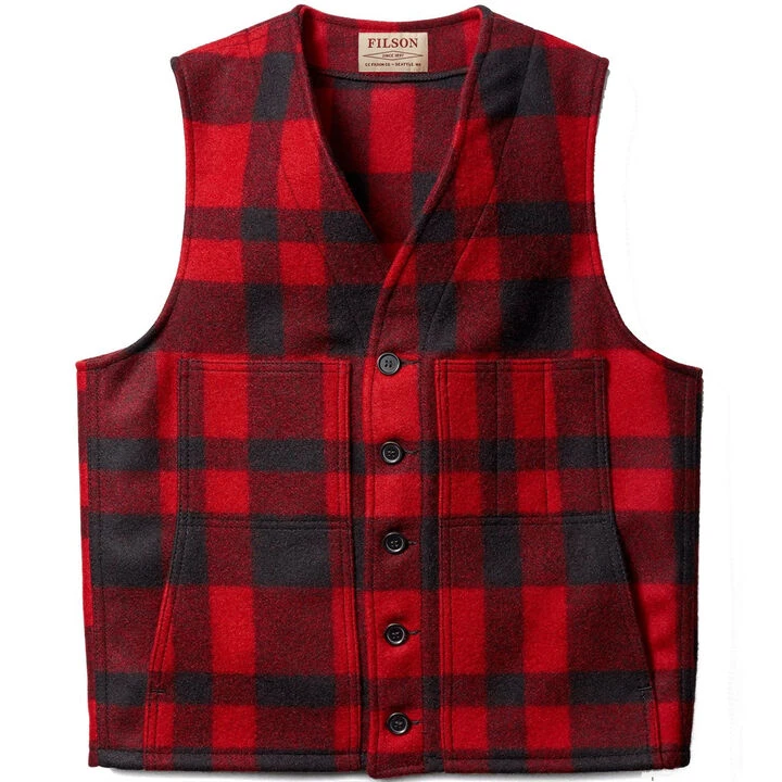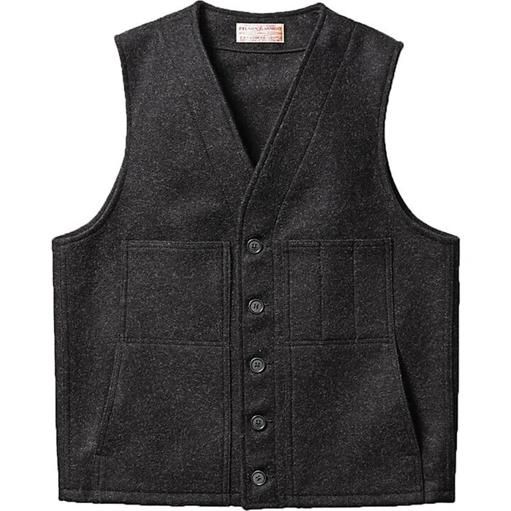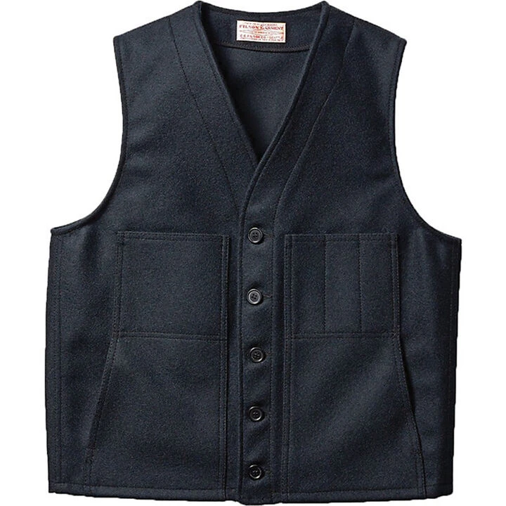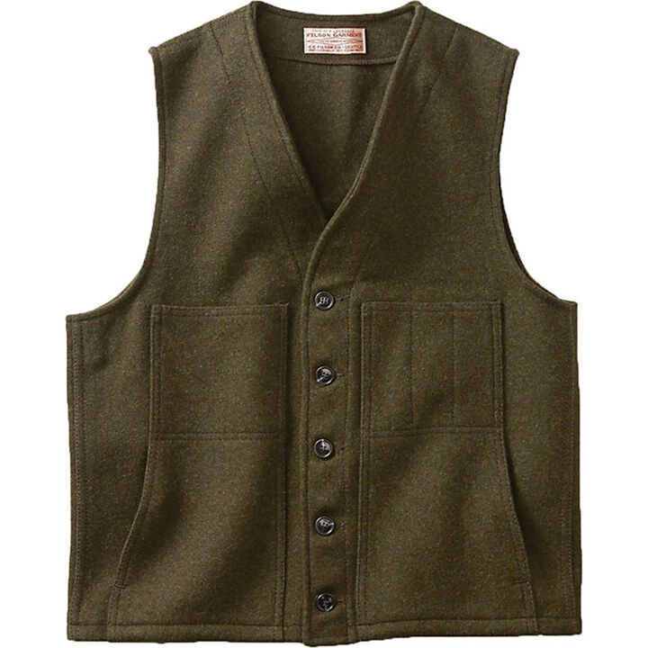 Durable, naturally rain-repellent Filson® Men’s Mackinaw Wool Vest is constructed of 100% Virgin Wool for moisture-wicking comfort. It features four pockets, a roomy fit for layering as needed and wide armholes for freedom of movement.