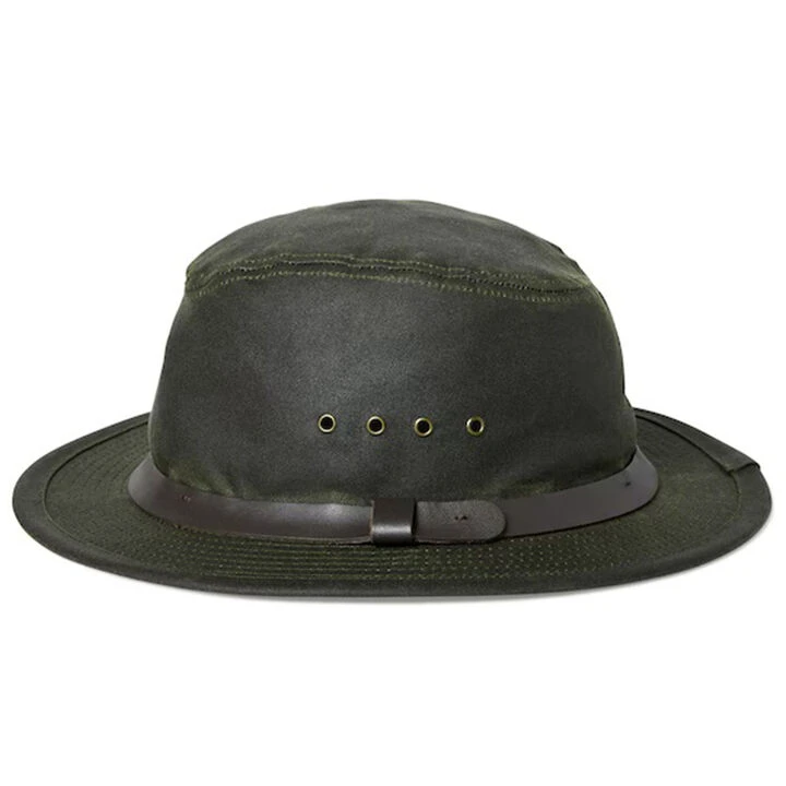Whether in the field or on the job, the Filson® Men’s Tin Cloth Packer Hat keeps you protected from the elements. Water-resistant oil finish Tin Cloth fabric withstands abuse for decades. Features a cotton sweatband, leather hatband and ventilating grommets in the crown. 2-1/4″ brim keeps the rain out of your face and off your face and neck.