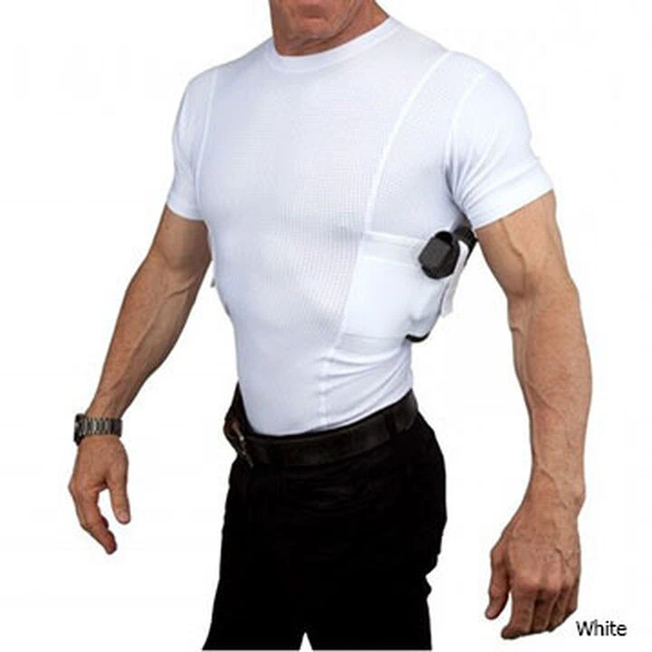 The Glock® Men’s Executive Concealment Crew Neck Shirt that features a concealment holster for your handgun on the left side and travel pockets on the right. The holster is designed to carry and conceal just about any self defense handgun (right draw only), while the travel pockets are perfect for concealing and a carrying valuable items such as your passport, credit cards, cash, cell phone, flash drive etc in the zippered pockets.